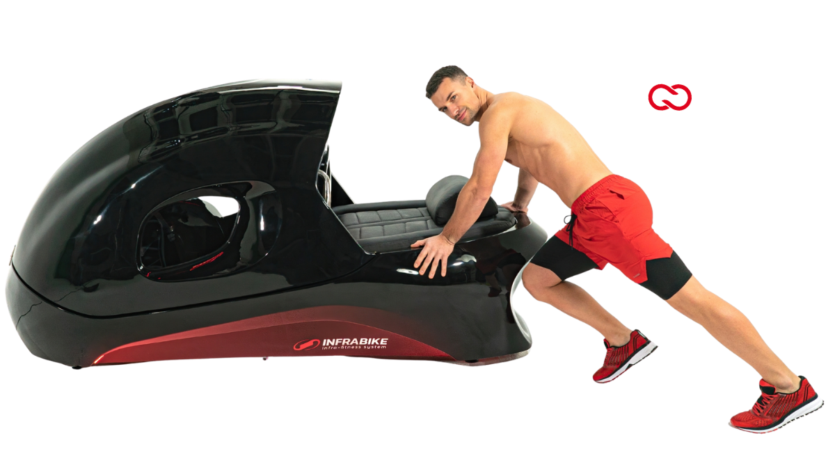 The Infrabike combines patented long infrared heat, zero-gravity air compression, collagen lamps and an immersive cycling system. 6× more calorie burn — in just 30 minutes.